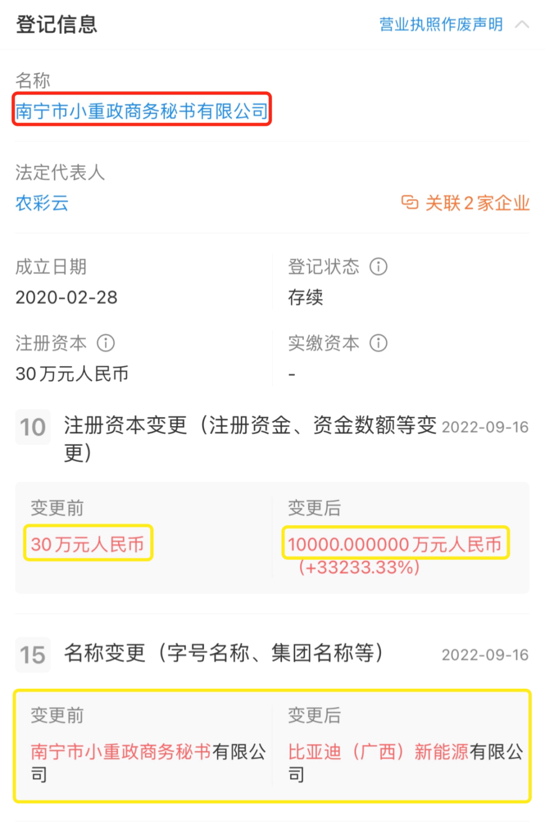 广西南宁一家名不见经传的小公司,对外声称被比亚迪汽车工业有限公司(以下简称:比亚迪汽车)全资收购,公司更名为比亚迪(广西)新能源有限公司,注册资本由30万元增加至1亿元。
