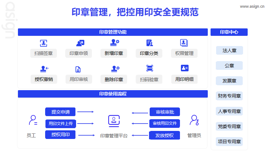 爱签打造“签+管+存+证”一体化印控管理,包括电子印章的统一制作、申请、授权、查询、变更、使用、销毁等全生命周期管理,可以对每一枚印章进行事前、事中、事后全流程印控管理。