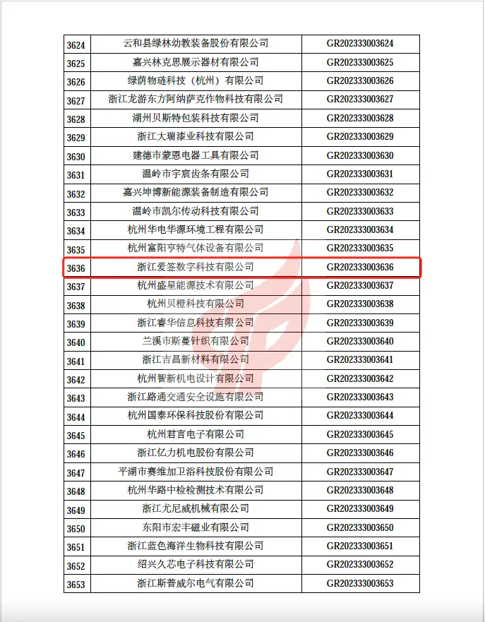 近日,全国高新技术企业认定管理工作领导小组办公室,对浙江省认定机构2023年认定报备的高新技术企业进行备案。浙江爱签数字科技有限公司凭借自身在电子签领域的技术实力和创新能力光荣入榜,由此正式迈入国家高新技术企业行列。