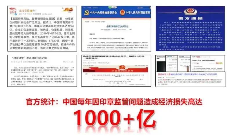 据官方统计,中国现有实体印章已经超过3亿枚,每年因印章监管问题造成经济损失高达1000余亿元。