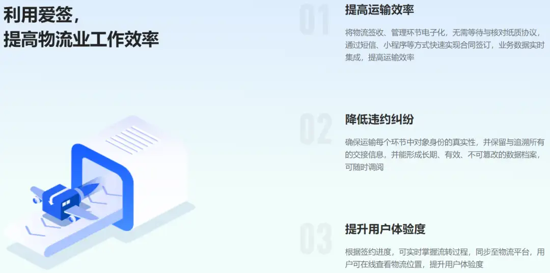爱签作为专业级区块链电子合同生态服务商,借助电子签名、区块链、声纹识别等关键技术,可以为物流企业提供安心高效的全流程电子合同服务。
