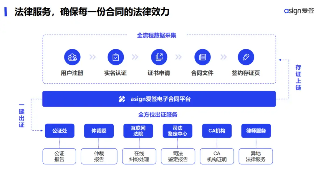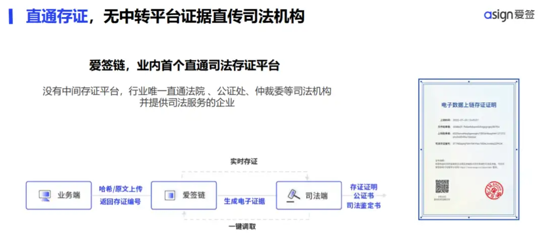 爱签构建了一套国家司法机构认可的可信安全存证体系,并与国内众多权威司法机构打通,实现了数据同步存证到法院、仲裁、公证等司法机构,为用户快速提供有司法效力的证据保全报告,实现司法赋能。