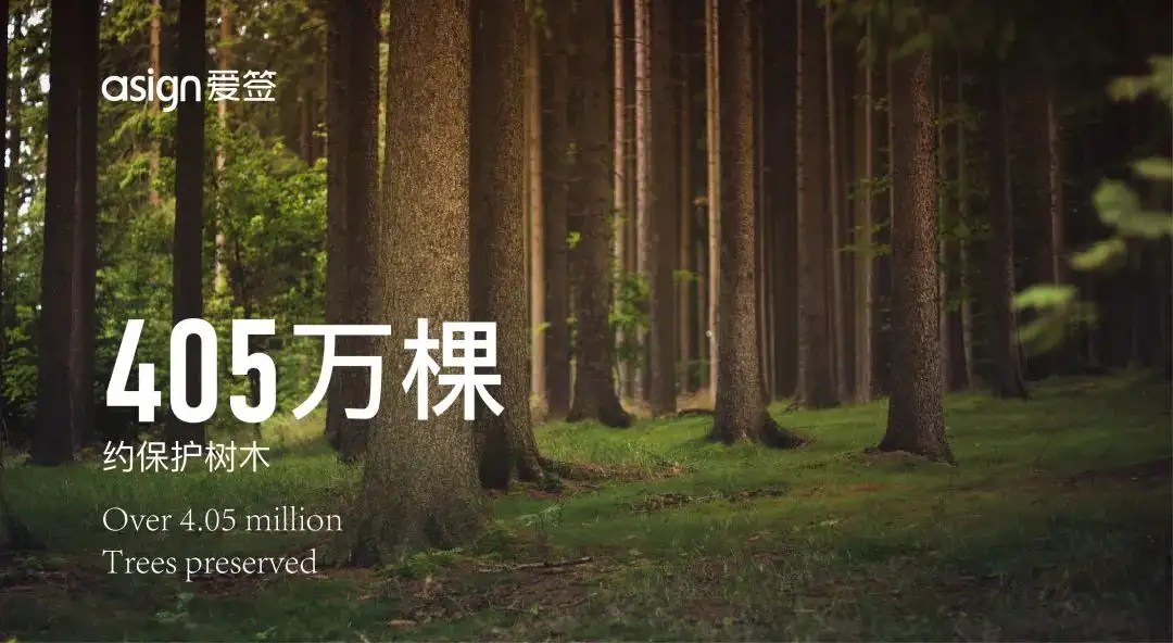 以爱签电子合同为例,据统计,爱签已为企业提供超30亿份电子文件签署服务。按照一份文件(一式两份)平均3张纸来算,爱签共帮助企业节省了超186亿张纸,相当于保护了405万棵树木,减少7.8万吨碳排放,降低污水排放309万吨。