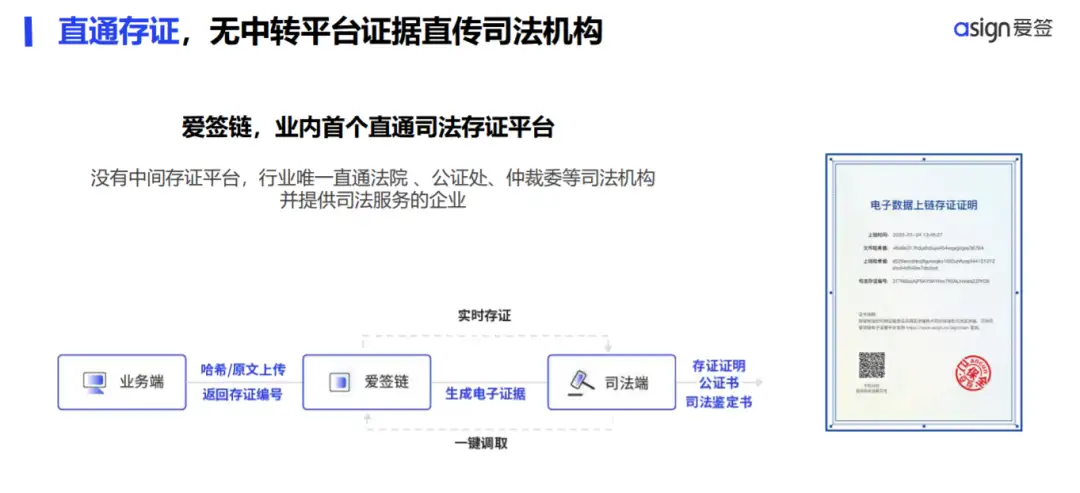 司法配套服务:爱签构建了一套国家司法机构认可的可信安全存证体系,并与国内众多权威司法机构打通,实现了数据同步存证到法院、仲裁、公证等司法机构,若出现纠纷情况,能为用户快速提供有司法效力的证据保全报告,切实保护各参与方的合法权益。