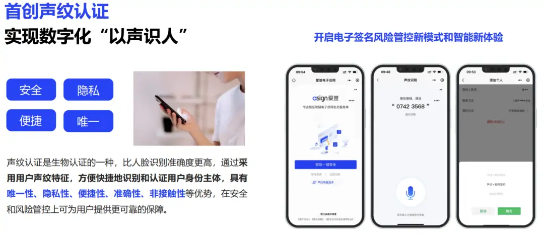 实名认证服务:爱签提供声纹认证、银行四要素、运营商三要素等多种实名认证方式,解决了目前企业签署合同时面临的各参与方真实身份核实难等问题,快速锁定签约主体真实身份,确保身份真实有效。