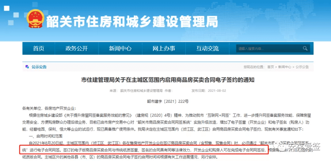 2021年8月2日,韶关市住房和城乡建设管理局发布《关于在主城区范围内启用商品房买卖合同电子签约的通知》,8月20日起,主城区范围内(浈江区、武江区)各在售房地产开发企业在签订商品房买卖合同(含预售、现售合同)时,必须通过“韶关市商品房买卖合同网签系统”进行电子合同网签。该政策的实施,实现了购房电子化,大大提高了办事效率。