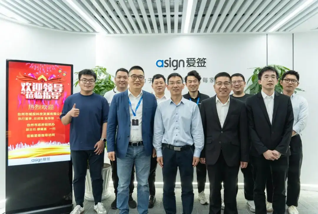 5月9日,台州市政府驻杭办副主任缪曜昌,台州市城投科技发展有限公司执行董事、总经理张华培,副总经理胡琪一行莅临爱签数字进行考察指导,对公司及产品服务内容进行详细了解。