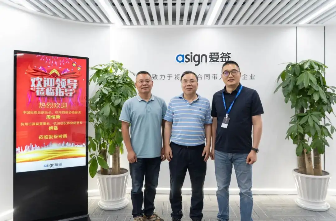 近日,中国投促会副会长、杭州创投协会会长周恺秉,杭州日报副董事长、杭州创投协会秘书长傅强一行莅临爱签调研考察,爱签CEO冯保龙(花名:无疆)表示热烈欢迎,并陪同周恺秉、傅强一行参观了爱签的办公环境,了解发展历程、业务模式、企业经营方法和发展之道等相关情况。