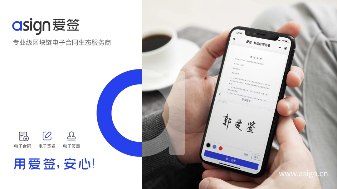 早在2015年,爱签就于行业内率先获得了电子合同在线签署发明专利。旗下爱签区块链电子合同签约平台(www.asign.cn),率先一步采用区块链技术,用可靠的电子合同、电子签名、电子签章替代了传统纸质合同与手写签署。