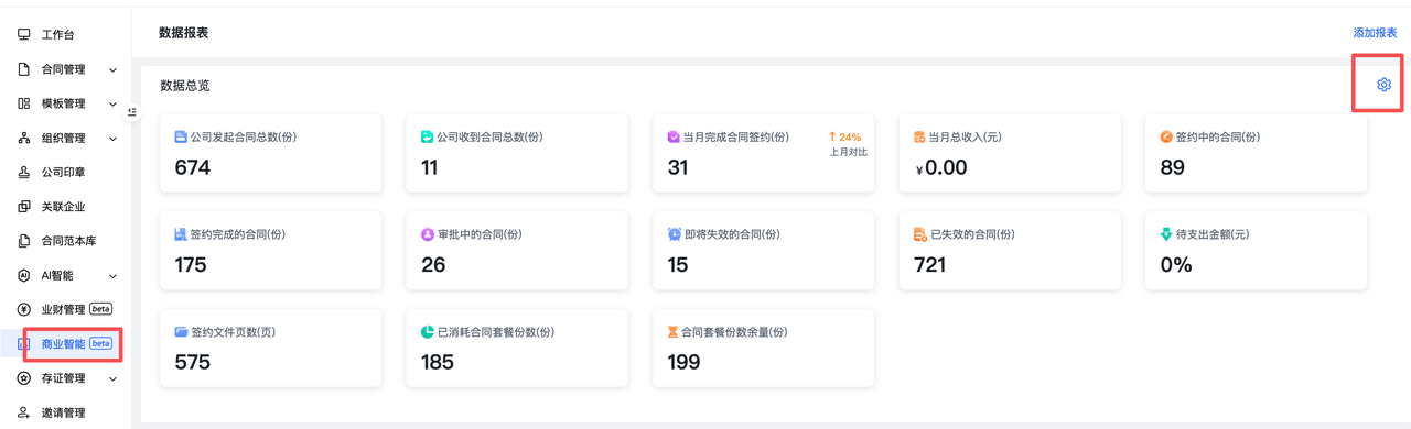一、产品价值 BI@AI数据智能驱动商业智慧,为企业经营管理上线“最强商业智慧大脑”!爱签BI@AI数据智能是基于企业大数据,利用数据挖掘和数据展示技术进行数据展示与分析的商业智能系统,具有真实、完整、可穿透的经营信息,直观、可视化的在线分析平台,是管理分析和经营决策的重要辅助工具。 二、使用操作 1.数据总览 在商业智能中点击设置-勾选需要查看的数据点击确定后即可以查看。 2.报表查看 在商业智能右上角点击报表添加-选择需要查看的报表保存即可