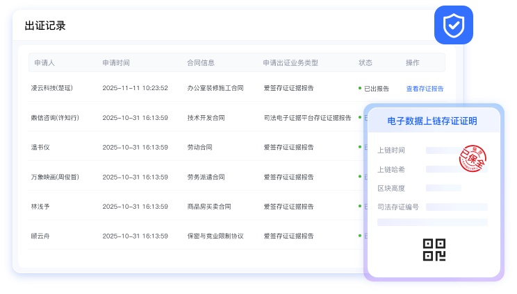爱签自研区块链,全流程智能固证,保障数据完整不可篡改。