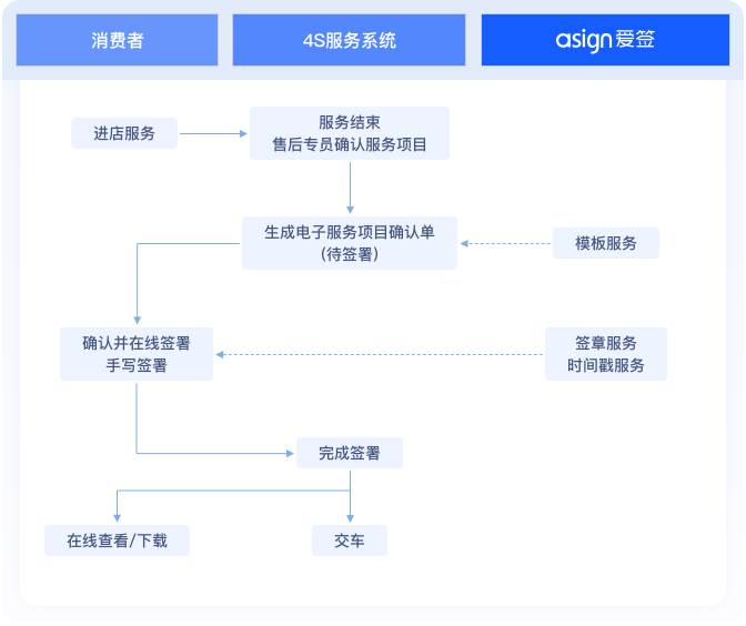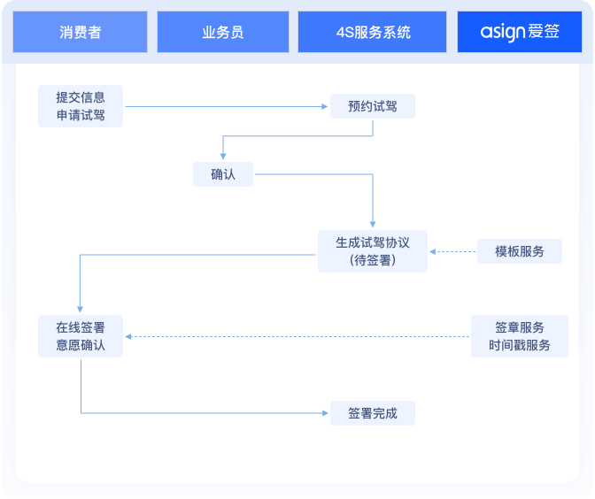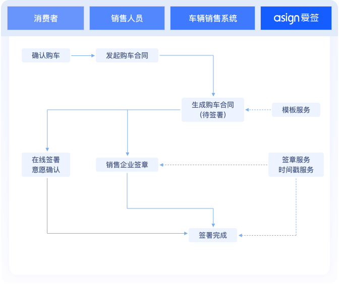 客户通过线上平台选车订车,系统生成销售合同及金融方案。通过爱签平台完成客户确认及经销商用印,实现汽车销售数字化。