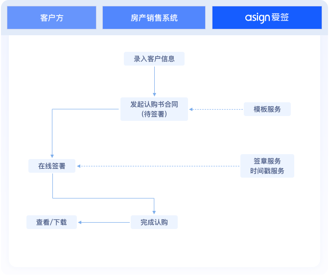 购房者通过线上平台选房,系统生成买卖合同及附属文件。通过爱签平台完成买卖双方及中介方电子签约,实现房产交易数字化。